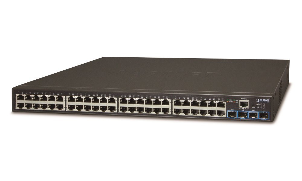 Porty: 48 x RJ-45 10/100/1000BASE-T, 4 x SFP+ 10GBASE-SR/LR, 1 x RJ-45 (RS-232) port konzole