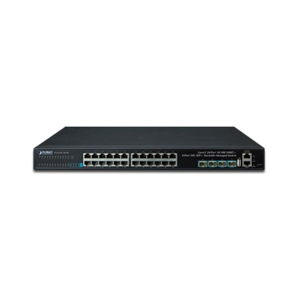 Stohovatelný řízený L3 switch, 24x 1000 Base-T, 4x 10G Base SFP+, správa Web/SNMP v3, HW stohování, IP stohování až 24 jednotek SGS-634x, podpora IPv6.