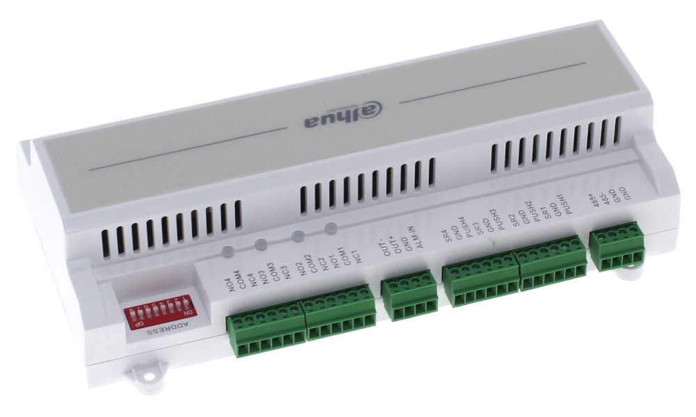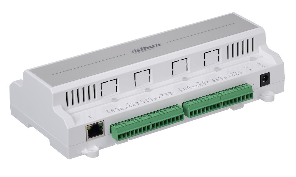Přístupový kontroler v provedení na DIN lištu pro 4 dveře (4 čtečky - karta, kód/PIN, otisk prstu). Pro čtečky lze využít protokol Wiegand nebo RS-485. Správa kontroleru po TCP/IP (dodaná aplikace pro Windows) nebo RS-485. Kapacita až 100 000 RFID a 150 000 záznamů. 4 dveřní sensory, 4 odchodové tlačítka, 1 alarm in; 4 dveřní zámky, 1 alarm out. Až 128 časových pravidel pro různé uživatele.