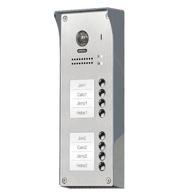 Dveřní stanice s 8 tlačítky, barevná kamera, CCD 1/3", reproduktor. Kryt hliník, povrchová montáž, úhel záběru 170° (rybí oko), kryt proti dešti, úroveň krytí IP45, za jmenovkou zabudovaná čtečka RFID čipů 125 KHz pro otevření zámku.