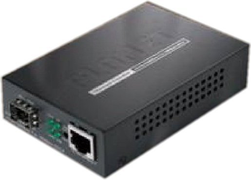 Gigabit Ethernet konvertor 1000Base-T / miniGBIC. Převádí optický Gigabitový Ethernet přes vložený modul konvertoru miniGBIC (SFP) na metalický. Web management.