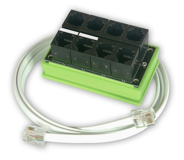 Konektory RJ-11 bez bílého označení jsou určené pro připojení jednoho čidla DS18B20. Propojovací kabel s LAN ovladačem se připojuje do bíle označeného vstupu RJ-11.
