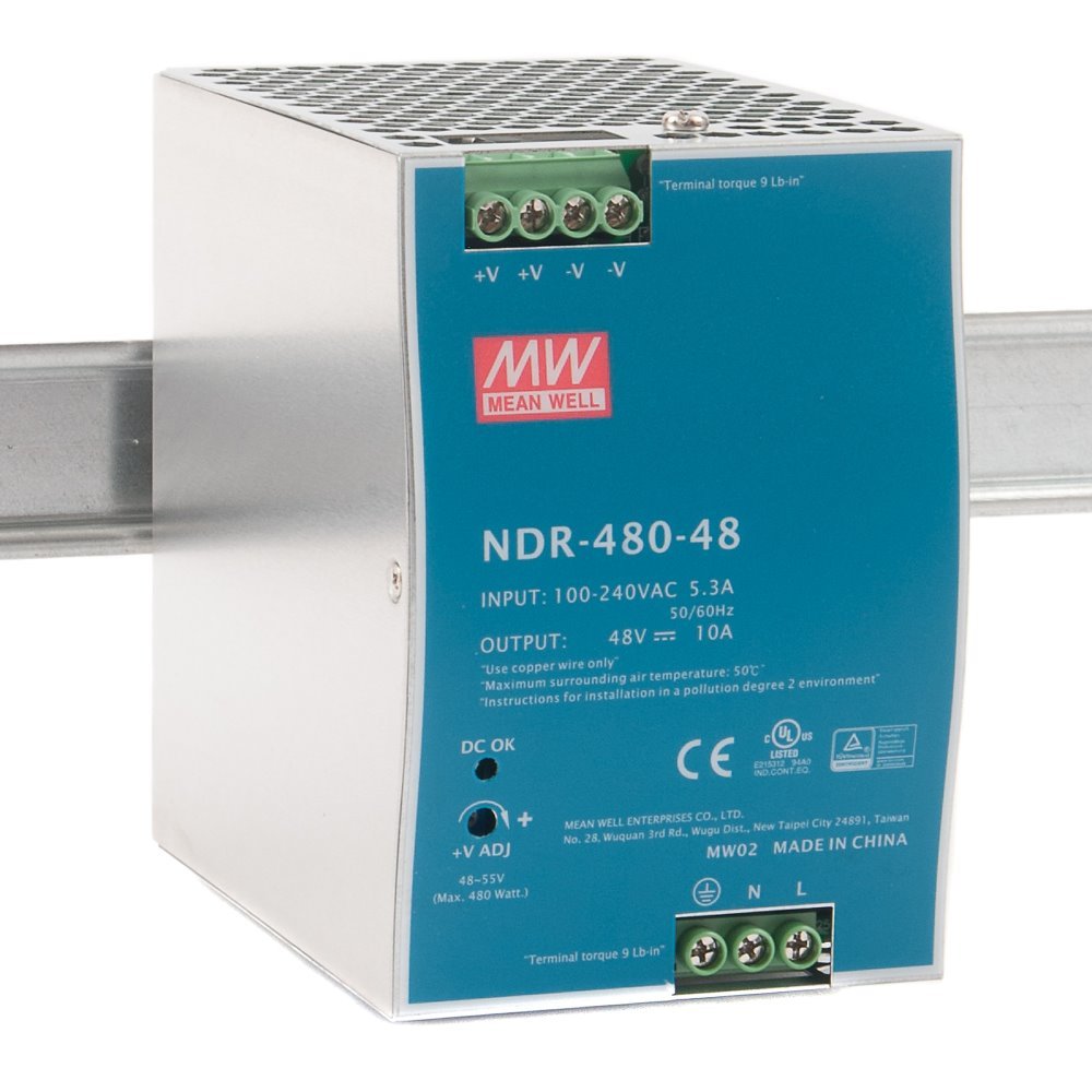 Napájecí zdroj pro instalaci na DIN lištu. Výstupní napětí regulovatelné 48 - 55 V DC, zatížitelnost 480 W. Provozní teplota -20 až 70°C.