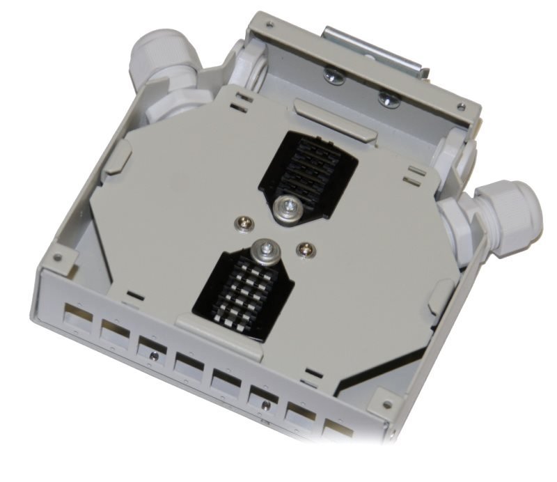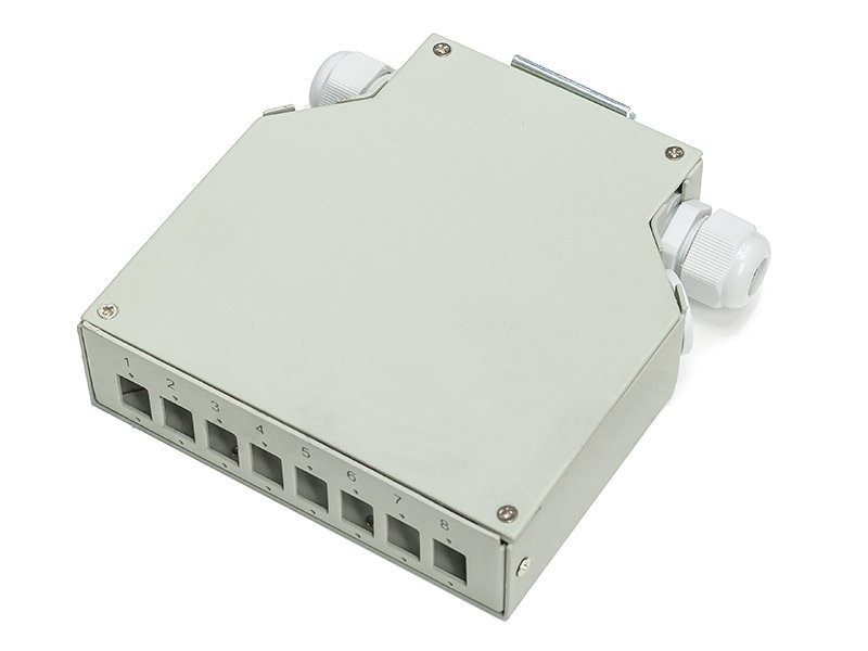 Malý kovový rozvaděč pro upevnění na DIN lištu. Dovoluje instalovat 8× SC simplex adaptér. Robustní kovové provedení, 4× vstup (2× zaslepený + 2× PG11). Kabel není nutno provlékat, lze i jen založit.