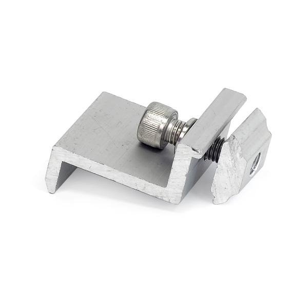 Držák (koncový) pro snadné uchycení prvního a posledního solárního panelu s 35 mm rámem na hliníkovou lištu řady SC. Použijte vždy 2 držáky na každé straně panelu. Pokud máte instalováno více panelů, použijte středový držák, který se umísťuje mezi panely. Upevňuje se pomocí imbusového klíče M8.