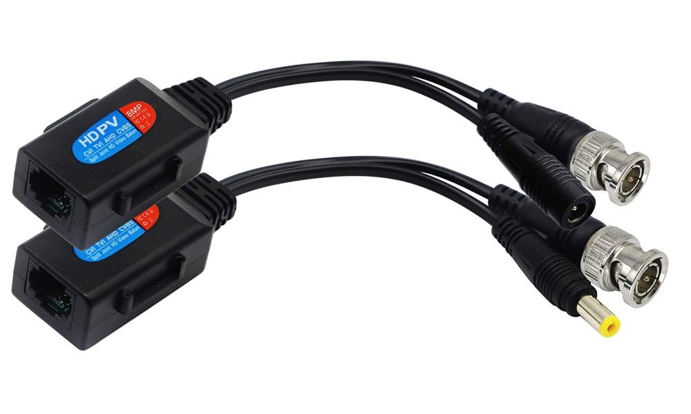 Pasivní balun umožňující přenos video signálu a napájení, pro přenos postačuje kabeláž Cat5. Pasivní přizpůsobení mezi 75 Ohm výstupem/vstupem systémů pro přenos videa a impedancí kabelového vedení UTP. Kontakt pro UTP RJ-45, koax. BNC. Přenáší video a napájení. Celkem využívá 8 vodičů. Napájení není nutné použít, každý přívod vyveden zvlášť. Napájení využívá 6 vodičů. Připojovací konektory připraveny přímo pro napojení na kameru/zdroj, 5,5/2,1 mm jack, samec a samice. Cena za pár.
