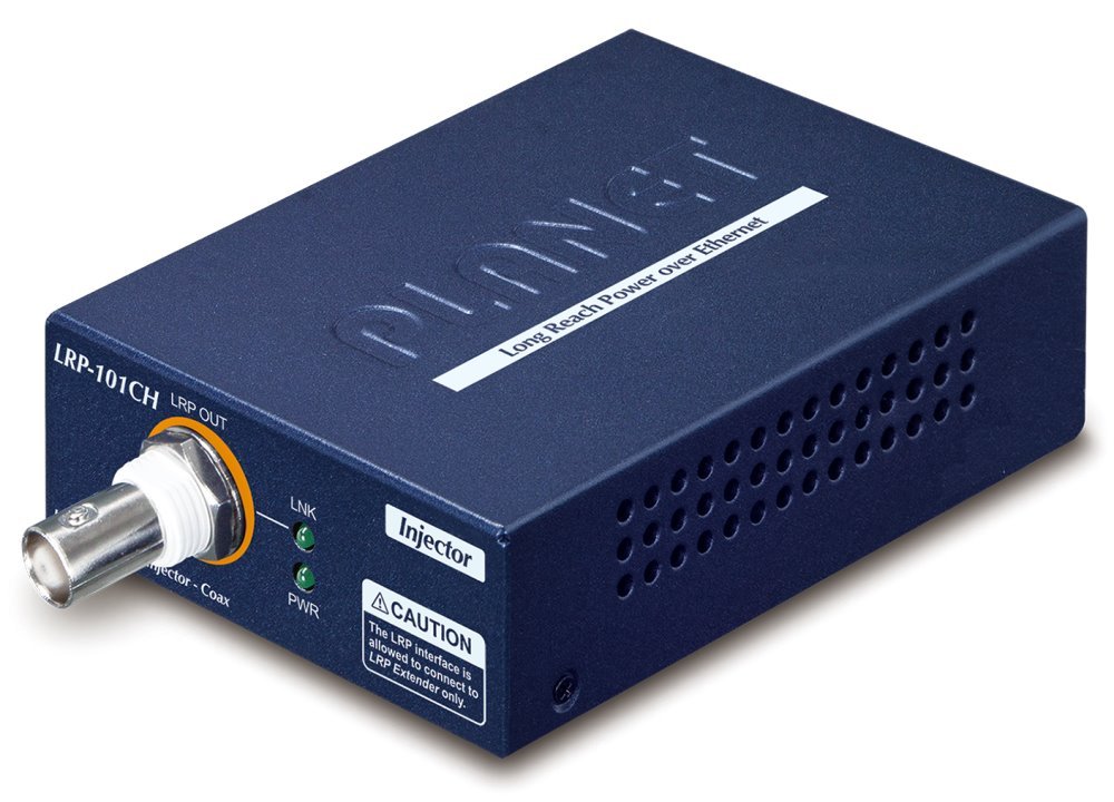 PoE Ethernet extender k prodloužení segmentu Ethernet ze 100 m na vzdálenost až 1 km (1,2 km bez PoE) po koaxiálním kabelu včetně podpory PoE napájení IEEE 802.3at/af.