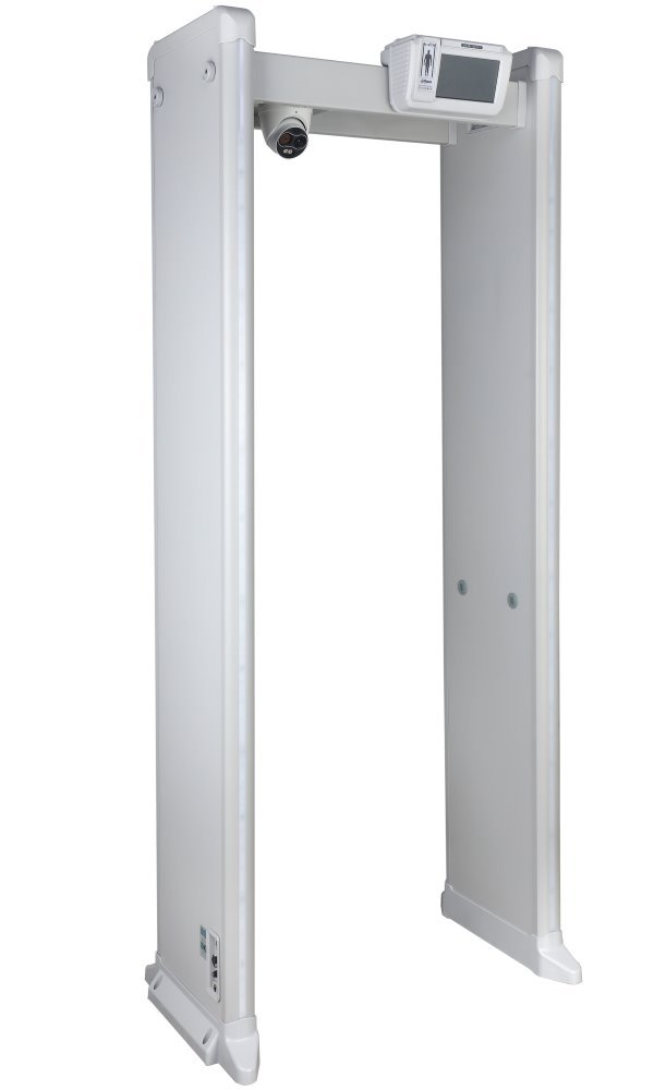 Průchozí detektor kovů využívá elektromagnetické pole a pro monitorování teploty IR kameru (detekce tělesné teploty).