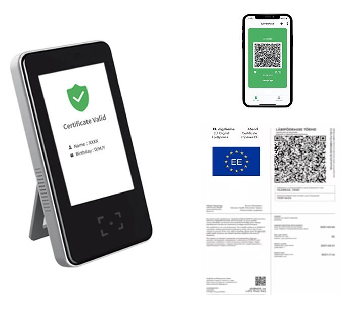 Čtečka QR Covid 19 kódů (certifikáty). Čtečka pro ověřování potřebuje být průběžně (nikoliv však neustále) připojena k internetu, je proto vybavena bezdrátovým připojením Wi-Fi i síťovým připojením LAN.