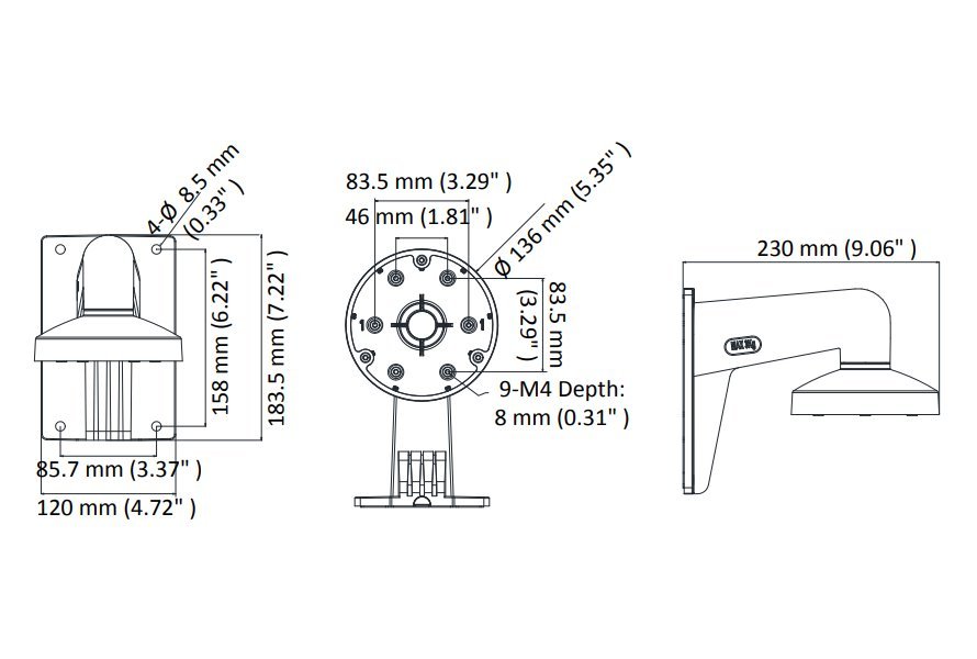 Držák pro montáž dome kamer na zeď, zatížitelnost 3 kg. Zeď musí unést více než 3krát větší hmotnost, než je celková hmotnost kamery a držáku.