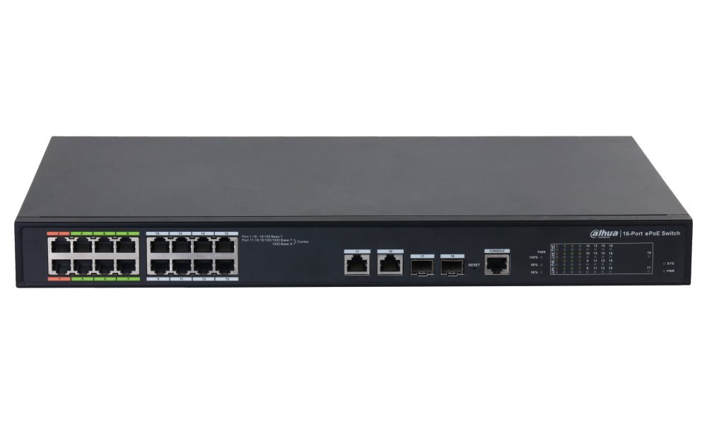 16portový PoE 10/100 Base-TX přepínač, včetně 2x 1000 Base-T a 2x SFP 1000 Base-X portů (2 combo porty RJ-45/SFP). Disponuje šestnácti Power over Ethernet injektory standardů IEEE 802.3af/at, z toho osmi s podporou napájení ePoE a dvěma porty UltraPoE (Hi-PoE) s napájením do 60 W/port. Celkový napájecí výkon je až 240 W.