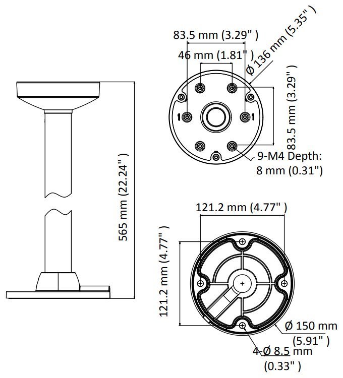 Stropní držák pro dome kamery Hikvision série D6xx. Zeď musí unést více než 3krát větší hmotnost, než je celková hmotnost kamery a držáku.