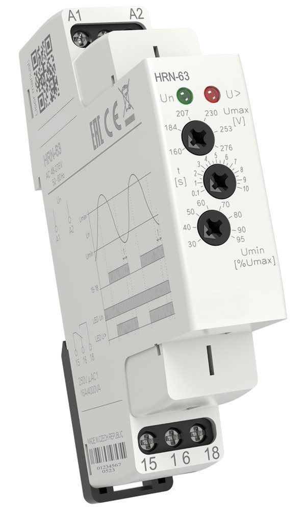 Hlídací relé HRN-63 slouží k hlídání úrovní napětí jednofázových obvodů v rozsahu AC 48–276 V. Hlídané napětí je pro přístroj zároveň i napětím napájecím. U relé je možno nastavit dvě nezávislé úrovně napětí. Při překročení Umax je aktivován výstup. Při podkročení Umin je výstup deaktivován. Tato kombinace zapojení výstupního relé je výhodná tam, kde se úplný výpadek napájecího (hlídaného) napětí považuje za chybový stav, stejně jako pokles napětí v rámci nastavené úrovně. Pro eliminaci krátkodobých špiček v síti slouží časová prodleva, kterou lze plynule nastavit v rozmezí 0–10 s. Uplatňuje se při přechodu ze stavu přepětí do stavu podpětí. Při návratu ze stavu podpětí do stavu přepětí se již prodleva neuplatňuje. Díky přepínacím výstupním kontaktům je možno dosáhnout dalších konfigurací a funkcí dle aktuálních požadavků nebo dané aplikace.