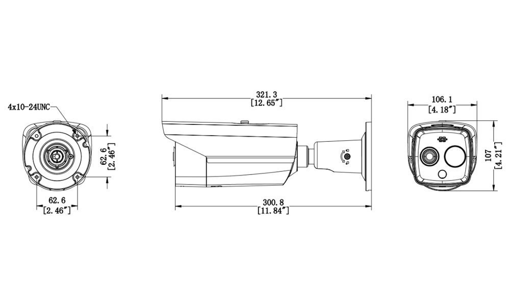 Bezpečnostní termální venkovní IP kamera s duálním snímáním v termo (256 × 192) a vizuální (2688 × 1520) oblasti. Rozlišovací schopnost pod 40 mK, objektiv f = 3,6 mm (50° × 37,3°), vizuální f = 4,3 mm (84° × 43,1°), podpora WDR (120 dB), IR a bílý LED přísvit do 30 m.