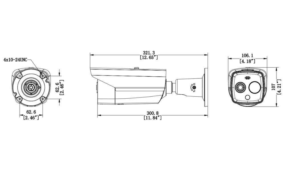 Bezpečnostní termální venkovní IP kamera s duálním snímáním v termo (256 × 192) a vizuální (2688 × 1520) oblasti. Rozlišovací schopnost pod 40 mK, objektiv f = 9,7 mm (18° × 13,5°), vizuální f = 8 mm (39,4° × 22,1°), podpora WDR (120 dB), IR a bílý LED přísvit do 30 m.