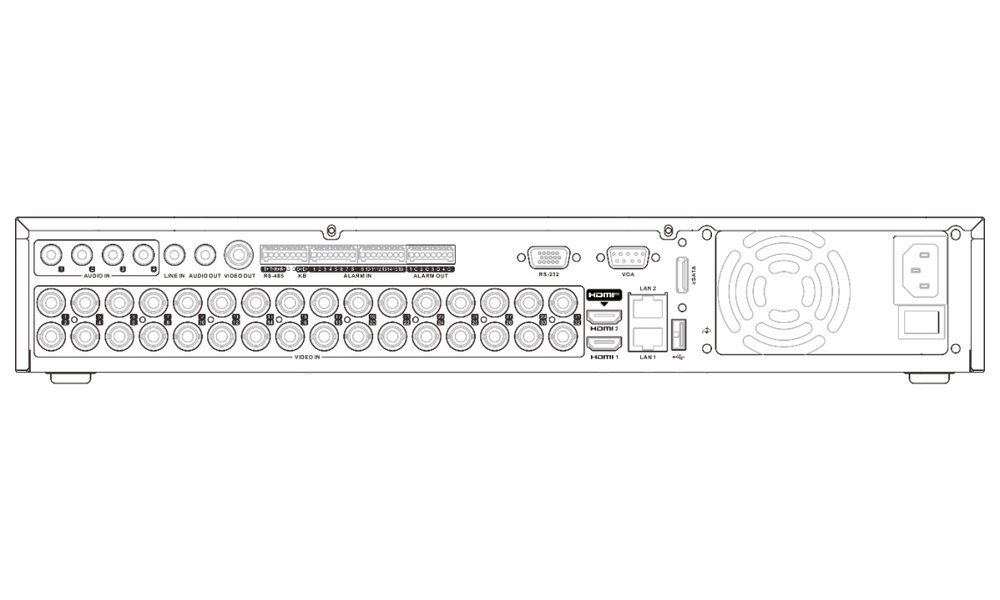 Porty: 32× BNC, 1× CVBS video výstup (BNC), 1× HDMI 4K výstup, 1× HDMI Full HD výstup, 1× VGA Full HD výstup, 2× USB 2.0, 1× USB 3.0, 2× GbE RJ-45, 1× RS-485, 1× RS-232, 1× rozhraní pro klávesnici (svorkovnice), 1× eSATA, 5× audio vstup, 1× audio výstup, 16× alarm vstup, 4× alarm výstup