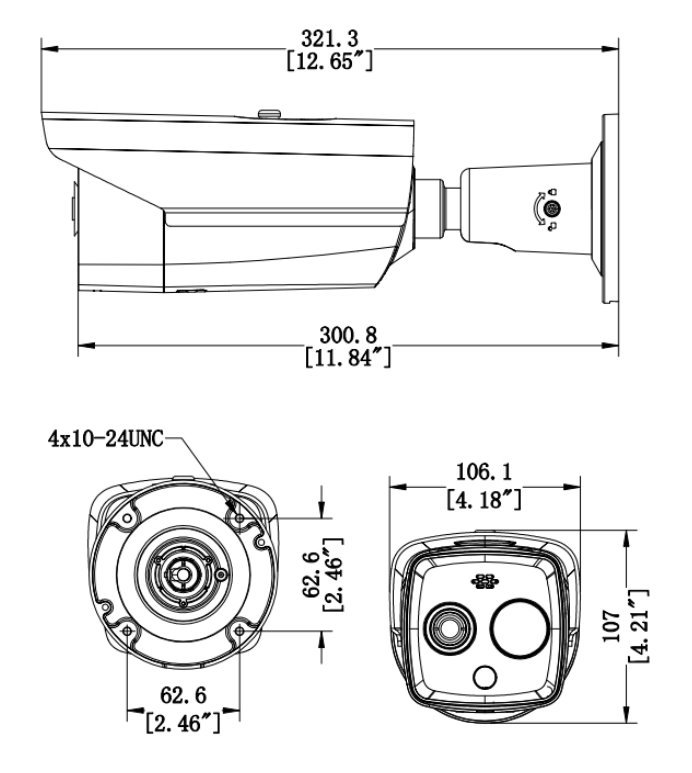 Bezpečnostní termální venkovní IP kamera s duálním snímáním v termo (256 × 192) a vizuální (2688 × 1520) oblasti. Rozlišovací schopnost pod 40 mK, objektiv f = 3,6 mm (50° × 37,3°), vizuální f = 4,3 mm (84° × 43,1°), podpora WDR (120 dB), IR a bílý LED přísvit do 30 m.