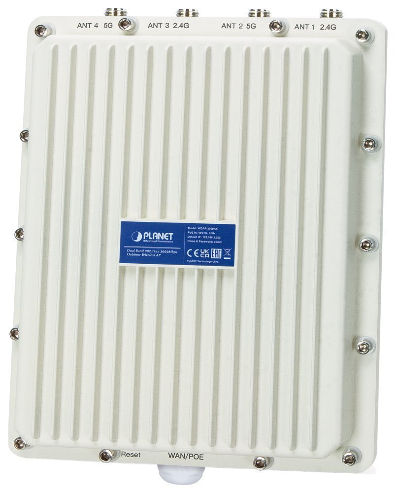 Odolný dvoupásmový Wi-Fi 6 access point s podporou centrálního managementu přes NMS kontroler pro vysokorychlostní podnikové řešení. Pracuje na frekvenci 2,4 GHz a 5 GHz standardu 802.11a/b/g/n/ac/ax a díky tomu nabízí rychlost až 3000 Mbps. Podporuje také technologie OFDMA, MU-MIMO, Beamforming a BSS Coloring. Velkou předností je možnost vytvoření Mesh sítě spojením několika přístupových bodů. Pokročilé zabezpečení díky šifrovanému přenosu dat dle protokolů WPA/WPA2/WPA3 účinně zabrání odposlechu neoprávněnými uživateli. Napájení jednotky je řešeno skrze PoE+ 802.3at, příkon do 15 W.