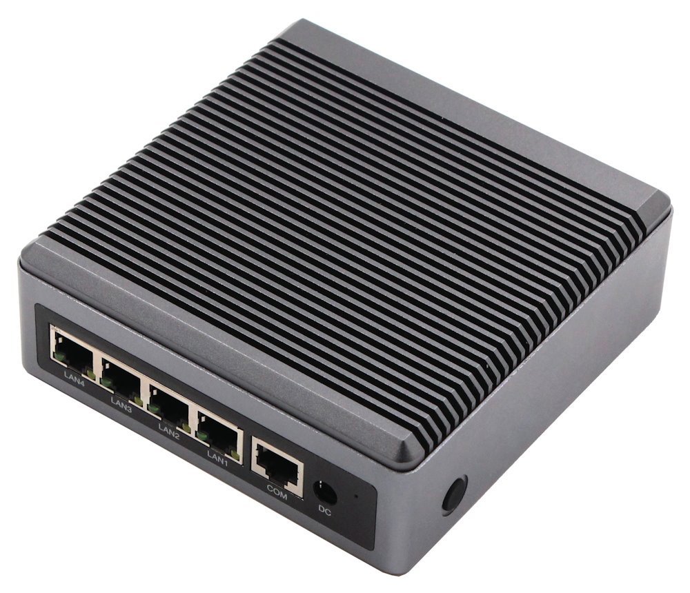 Barebone, Intel Celeron J6412, Intel UHD, SO-DIMM, 2× HDMI, 4× LAN, 2× USB 2.0, 2× USB 3.2, 1× COM (RJ-45), TDP 10W, fanless
