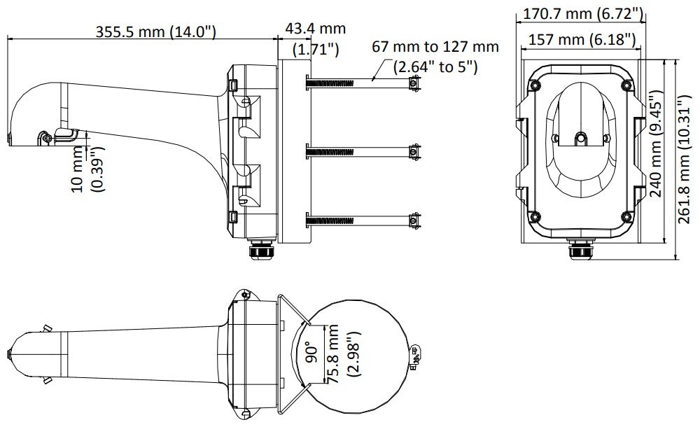 Vertikální držák pro montáž PTZ dome kamery na sloup, zatížitelnost 10 kg. Držák je vhodný pro vnitřní i venkovní použití a měl by být instalován na sloup o průměru 67–127 mm. Sloup musí unést více než 3krát větší hmotnost, než je celková hmotnost kamery a držáku.