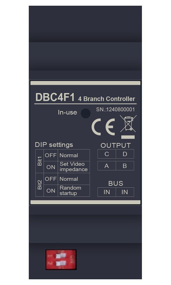 Rozbočovač pro všechny typy domácích monitorů 2vodičové analogové sběrnice D2 vč. Wi-Fi monitorů. Je vhodný i pro dveřní stanice. Navíc má volbu pozdního časově proměnného zapnutí (DIP2 = ON). Když připojíte zdroj, zapínají se DBC4F1 postupně a nemohou způsobit krátkodobé přetížení zdroje.
