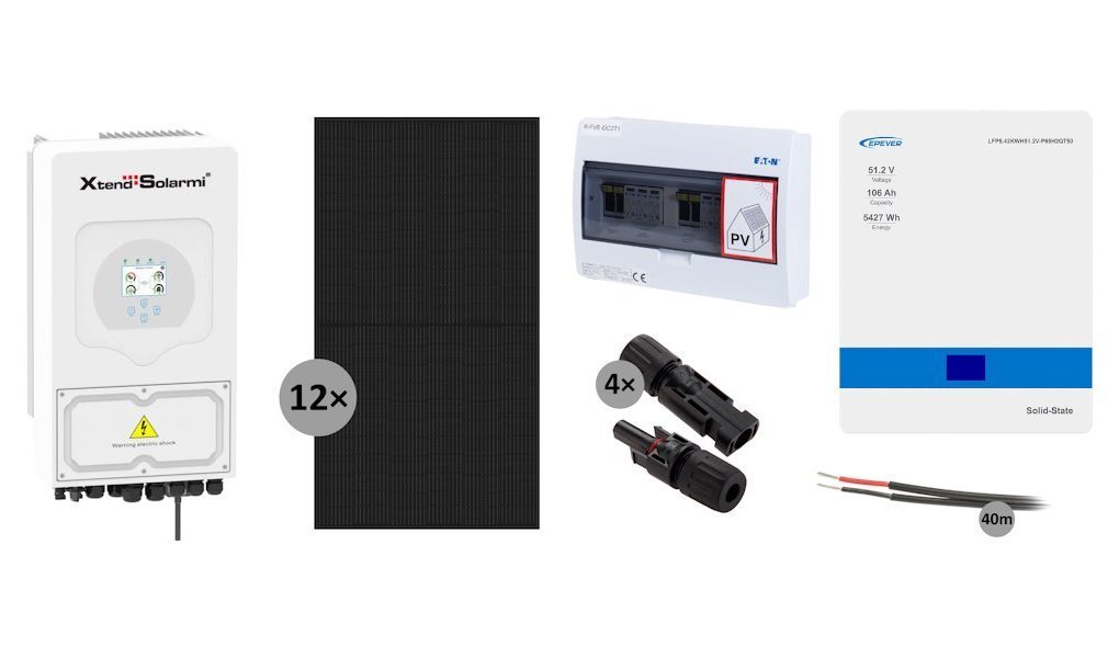 - 1× Xtend Solarmi SUN-5K-SG03LP1-EU – Měnič napětí, integrovaný limiter, výkon 5kW, jednofázový, 230V, MPPT, SVT30543