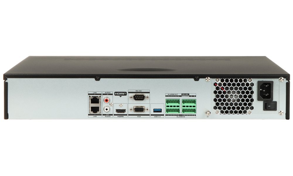 Porty: 1× HDMI 4K výstup, 1× VGA Full HD výstup, 2× USB 2.0, 1× USB 3.0, 2× GbE RJ-45, 2× RS-485, 1× RS-232, 1× audio vstup (RCA), 1× audio výstup (RCA), 16× alarm vstup, 4× alarm výstup