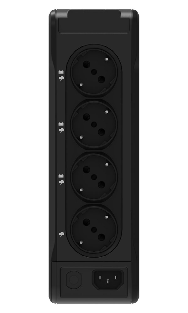 Zdroj je vybaven 3 zásuvkami s ochranou proti přepětí a záložním napájením a 1 zásuvkou pouze s ochranou proti přepětí v DIN standardu (Schuko). Díky elegantnímu a kompaktnímu designu se zdroj hodí do jakéhokoliv prostředí - můžete jej umístit horizontálně, vertikálně nebo s volitelným příslušenstvím i na stěnu či do racku.