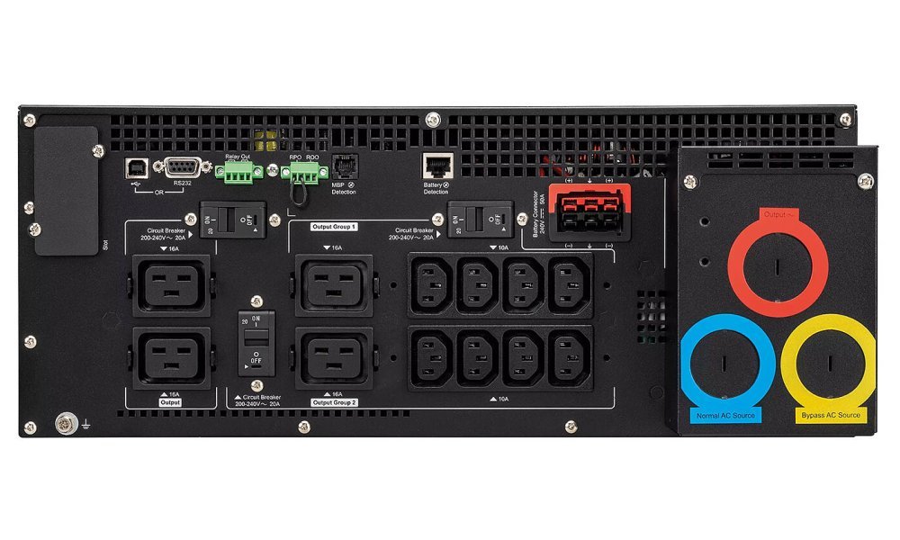 UPS disponuje pokročilým systémem správy baterií ABM+ pro prodloužení životnosti, grafickým LCD displejem pro snadnou konfiguraci a monitorování, a interním bypassem zajišťujícím kontinuitu provozu i v případě poruchy. Součástí balení jsou podpěry pro montáž jako tower, 3 kabelové průchodky, 2 výstupní kabely IEC-IEC (1,2 m) a USB kabel (1,8 m).